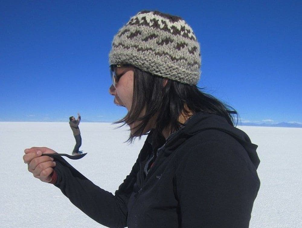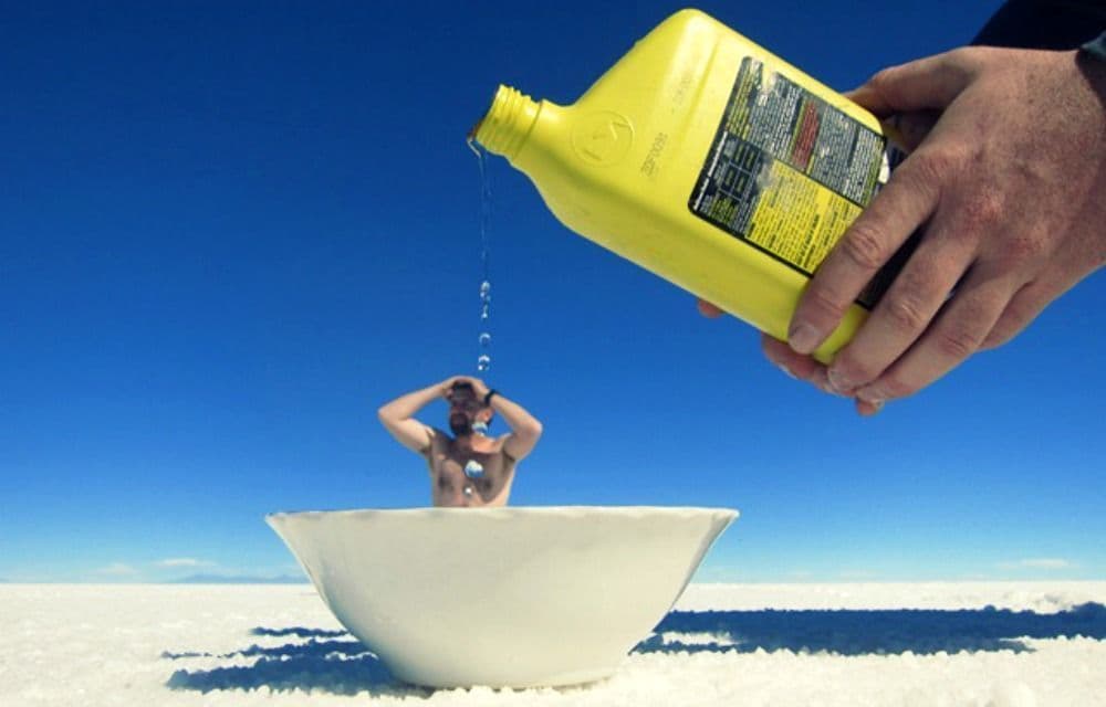 Die Salzwüste bietet tolle Perspektiven für lustige Fotos. Am besten machen Sie sich schon im Voraus ein paar Gedanken darüber, was für Fotos Sie machen wollen, und bringen das nötige Equipment mit. Besonders gut geeignet sind kleine Spielzeugtiere, die man auf den Fotos als gigantisch erscheinen lassen kann.